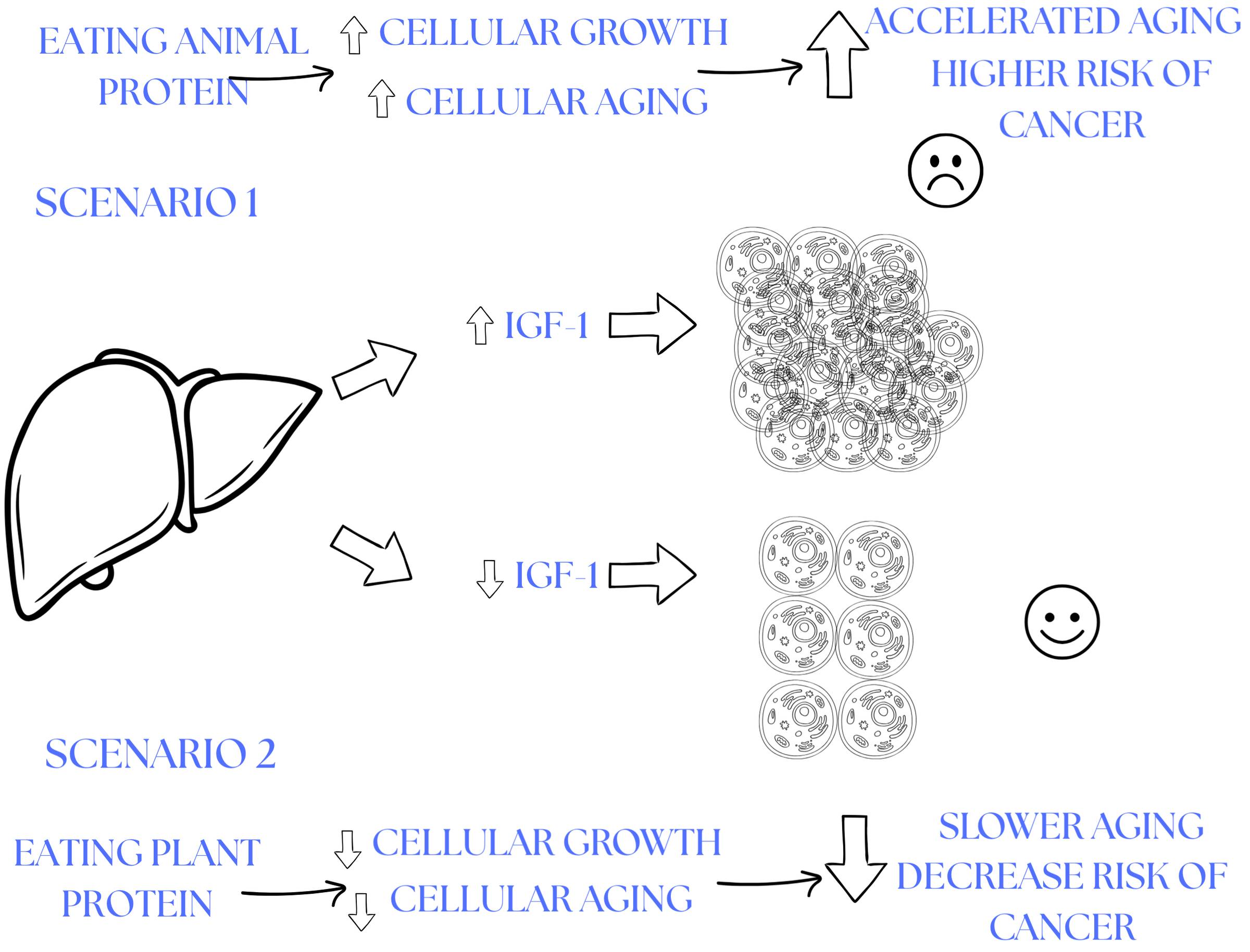 → slower processing→ weaker growth signaling→ lower IGF-1→ slower aging at the cellular level